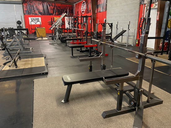 Multiple Combo Racks and Several Sets of KG PlatesA Powerlifting Staple, a Combo Rack will be the rack of choice for most Powerlifting Federations. Perfect for people who like training with a partner or group due to the ease of changing the rack height. Dog not included….. Sometimes he’s included